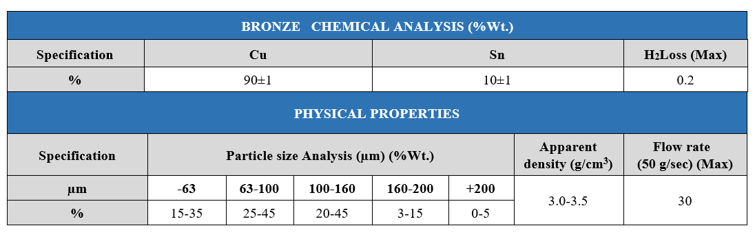 از این پودر برای تولید انواع قطعات برنزی به روش متالورژی پودر استفاده می¬شودکه به روش فرایند اتمایزینگ آبی تولید می¬شود. خلوص بالا، ترکیب شیمیایی دقیق و کنترل شده و دقت ابعادی بالا از جمله خواص پودرهای تولیدی به این روش است.